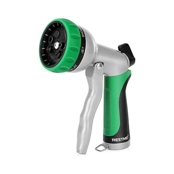 Heavy-duty metal garden hose nozzle with 8 adjustable spray patterns (Shower, Jet, Flat, Center, Cone, Full, Mist, Soaker) and ergonomic non-slip rubber grip handle for comfortable watering and cleaning tasks
